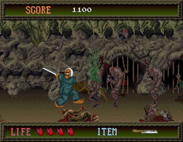 While Altered Beast applied mythological fantasy to the side-scrolling beat-‘em-up genre, Namco’s Splatterhouse threw a bucket of bloody entrails over it, bringing gore-soaked horror to the genre in a very direct – and controversy-stirring – manner. The less than subtle approach taken by Namco for Splatterhouse was immediately evident in the fact that protagonist Rick wore a blue boiler suit and a hockey mask – squint your eyes and the game could be Jason Voorhees Super Hack Blood Man Adventure.
