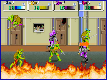 The game featured smooth animation and fast-paced gameplay, and was packed with personality. And with bold, colourful graphics and decent-sized sprites, the art design was a faithful recreation of the animated series, with each Turtle using his trademark weapon to fight a cast of villains familiar to fans of the series, including flailing, shrieking brain / scrotum creature Krang; and nemesis-who-sounds-suspiciously-like-Uncle-Phil-from-TheFreshPrinceofBelAir Shredder.
