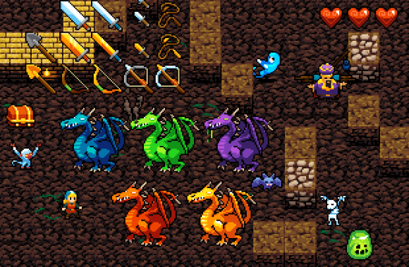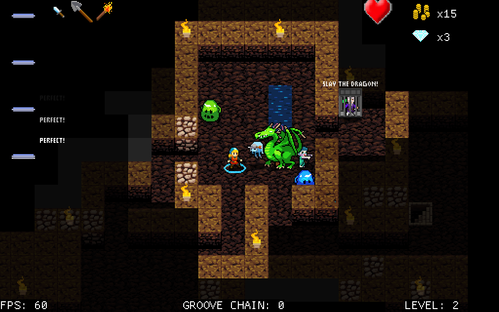 R: The biggest difference is that you have very little time to ponder your next move. To compensate for this, all of the enemies have very predictable movement patterns. So when you see a skeleton coming at you, or a slime, or a zombie, an experienced player will know exactly where that enemy will move next. So you need to size up the situation while the enemies are a few tiles away, and position yourself so that you’ll hit the enemy instead of the enemy hitting you!