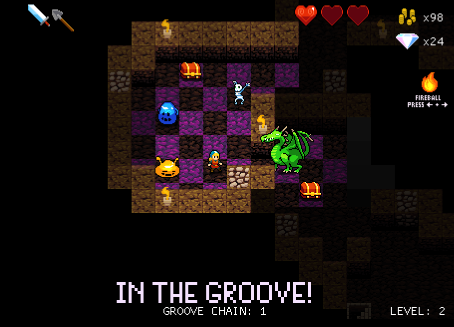 R: The core is the movement on the beat, of course, but we do have some twists. First, when you kill an enemy you begin a “groove chain”. If you keep moving on the beat (without missing a beat or getting hit) you will continue the chain. As you kill more and more enemies while staying “in the groove” your coin multiplier grows. (This affects the number of coins dropped by enemies.) The game is quite easy to play if you sit and wait for enemies to come at you, but if you want to gather enough coins to buy the more powerful items in the shop, you’ll need to master the art of fighting while staying in the groove.