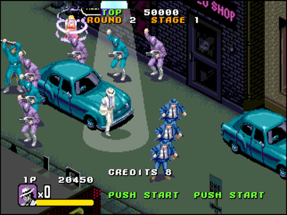 Another licensed video game of note wasn’t based on a popular animated television series but rather something that was a combination of pop music and cinema. While it was more a barely structured collection of extended music videos rather than an actual narrative movie, 1988’s Moonwalker, starring Michael Jackson, was a commercial success at the box office, and this led to several video game adaptions beginning the following year. While the home computer and console versions of the game were essentially platform games, the 1990 arcade version was a beat-‘em-up. If you’ve been crying out for a video game where a chimp transforms you into a laser-blasting robot and you fight Joe Pesci on the moon, then this is the game for you.