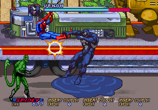While some superhero beat-em-‘ups such as Spider-Man: The Video Game barely bothered with story (Mary Jane’s been kidnapped? What a twist!), others such as The Death and Return of Superman and Marvel Super Heroes: War of the Gems were adapted from existing comic book stories, with some titles being impressively faithful adaptions. For example, for its cut-scenes, Spider-Man and Venom: Maximum Carnage frequently used art and dialogue taken directly from the comics. Beat-‘em-up adaptions of some superhero movies of the time also appeared, as seen in the SNES version of Batman Returns, and in Batman Forever: The Arcade Game.